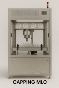 The capping unit secures aluminum caps onto vials with consistent torque, ensuring container closure integrity post-filling.