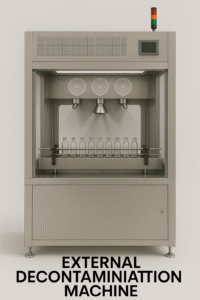 The EDM removes residual product and contaminants from vial exteriors using high-pressure washing and HEPA drying.