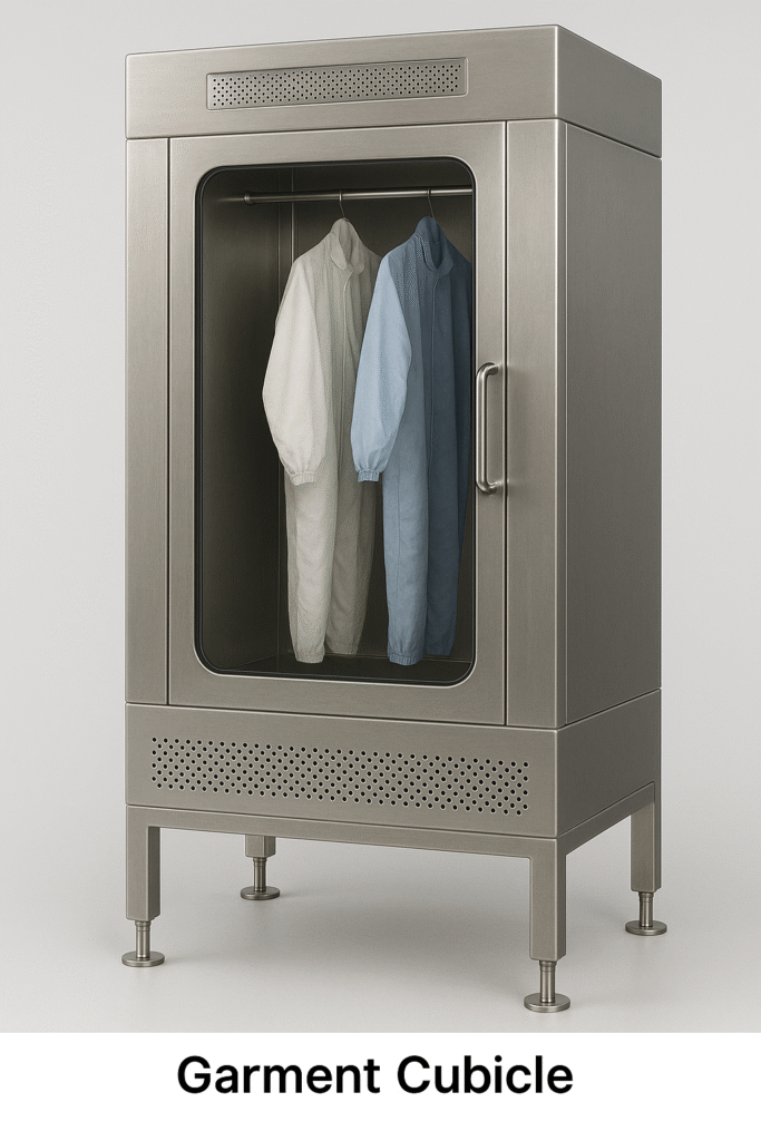 Garment Cubicles keep cleanroom garments contamination-free before use through filtered airflow and controlled storage.